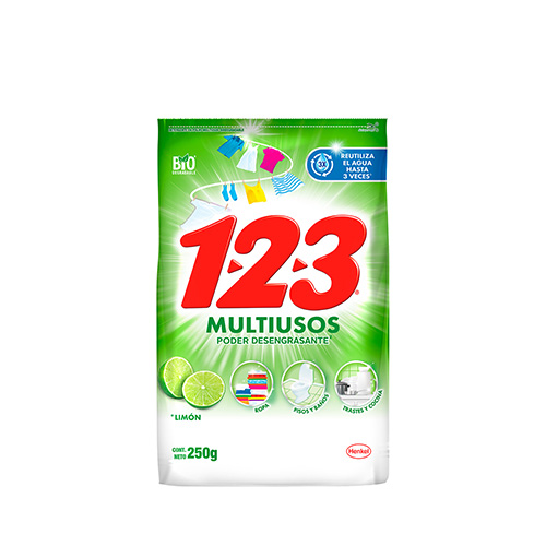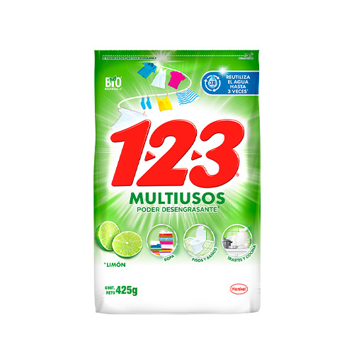 Detergente 123 Limón Multiusos es el aliado ideal para mantener tu hogar limpio y fresco con facilidad. Su fórmula concentrada elimina eficazmente la grasa, suciedad y manchas en diversas superficies como pisos, baños, cocinas y más.